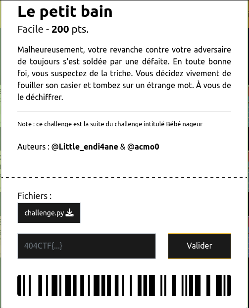 dans le fichier challenge.py, on peut alors effectuer la même attaque que pour Bébé nageur.