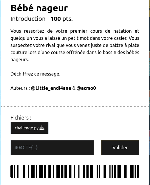 Il s’agit d’un chiffrement affine, on est donc face à un problème du type c(x) = ax+b [n], où a et b sont les clés de notre chiffre. On peut effectuer un brute-force sur a et b (les valeurs possibles étant très restreintes). L’autre façon de faire est de récupérer a et b en faisant une attaque à clair connu. En effet, le format du flag est 404CTF{ ... }. De plus, on a la correspondance entre les caractères et leur représentation numérique. En prennant les deux premiers caractères du flag, on a un système du type :